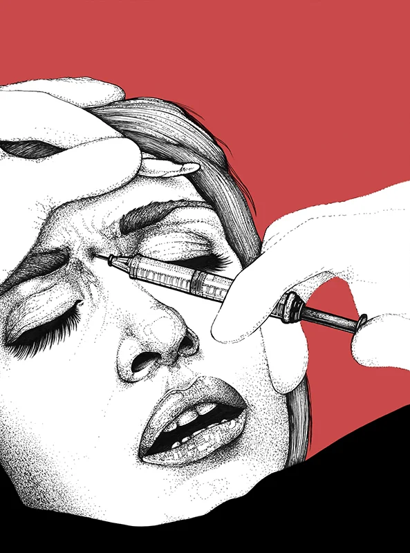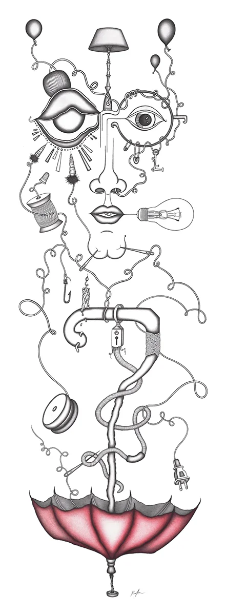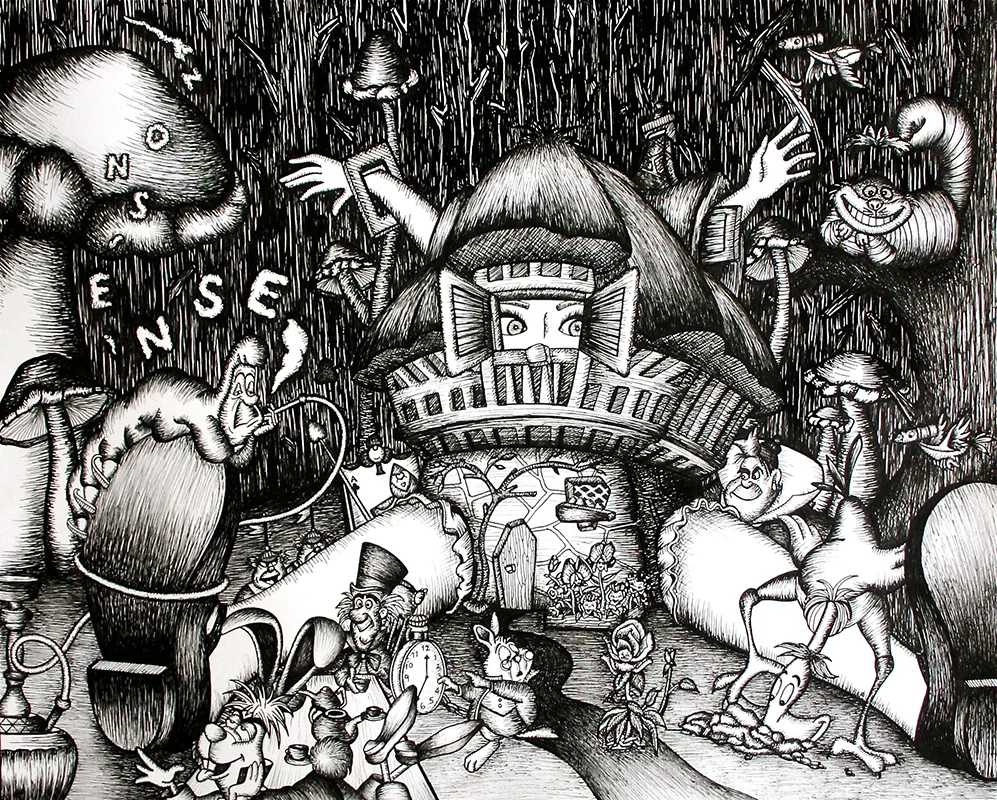 brown pen, marker, white pen and colored pencil on mid-toned paper